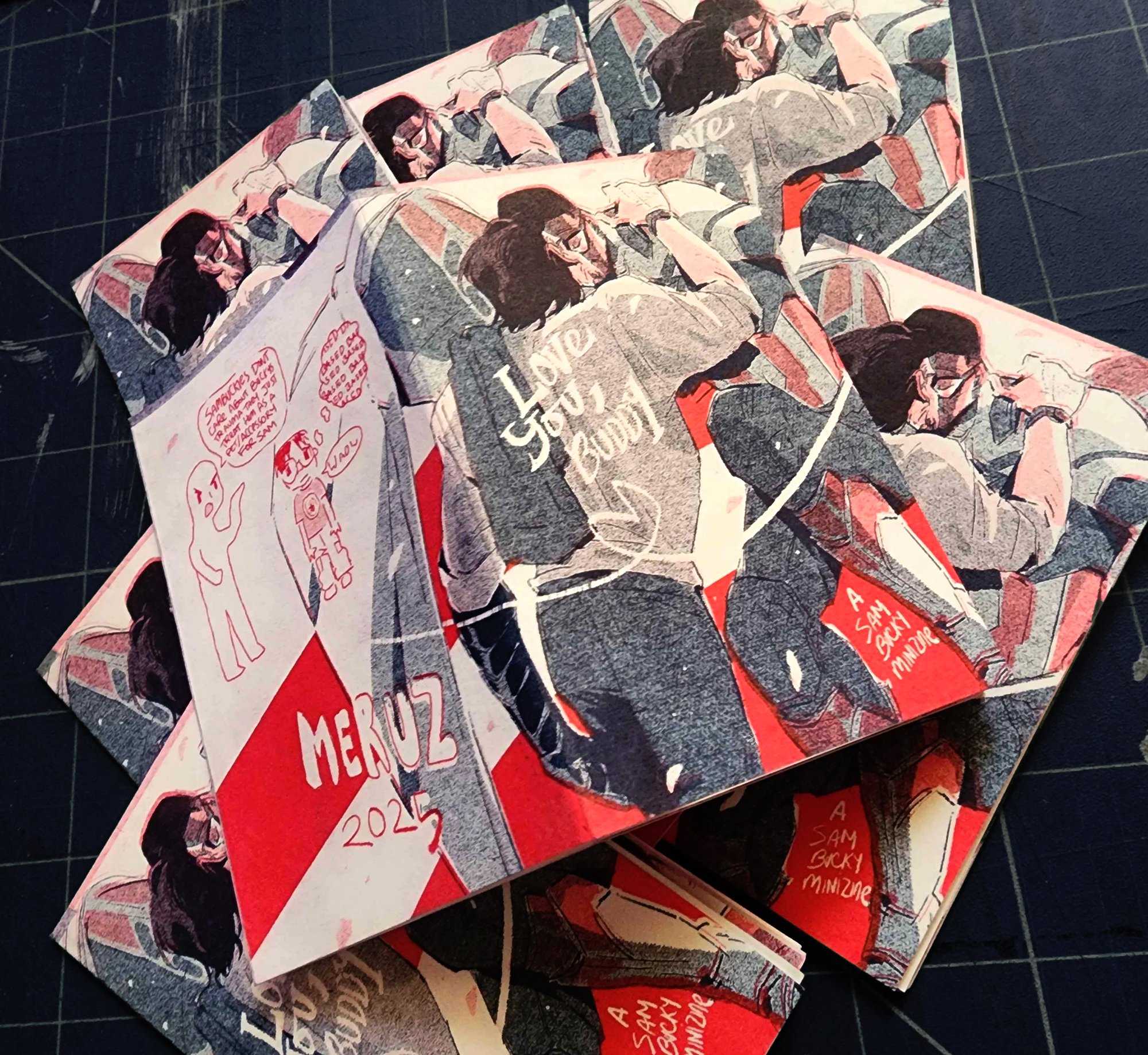 Comes in either 2-color risograph or blue cardstock which has an extra drawing if you unfold the zine.