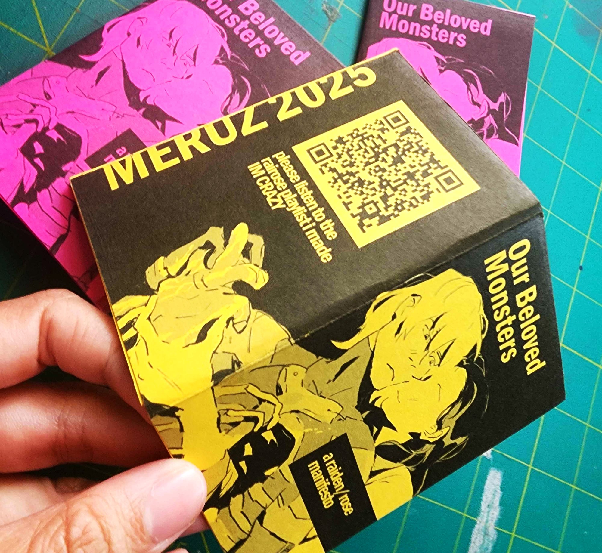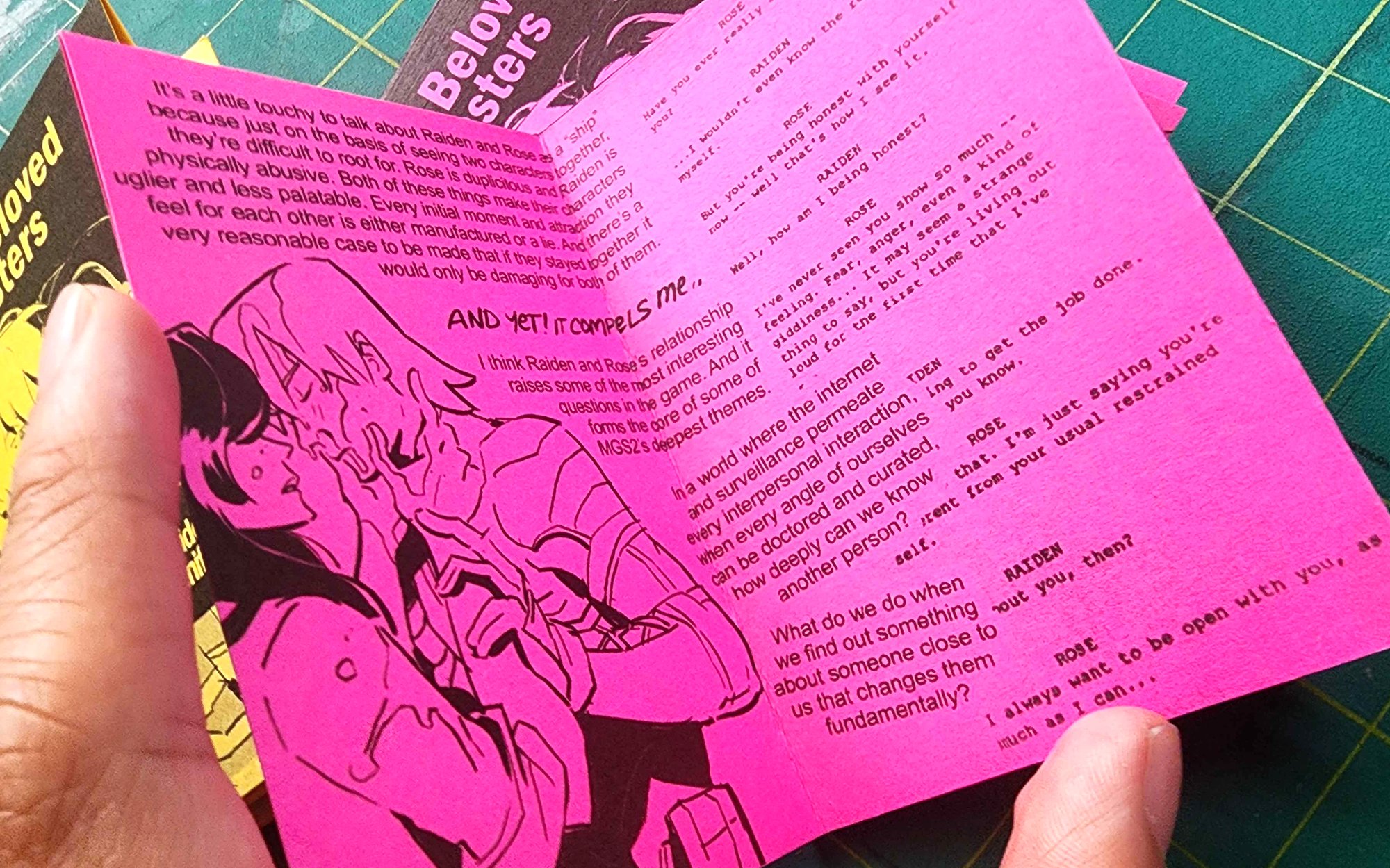 6pg MGS2 minizine printed on neon cardstock featuring drawings and thoughts about why Raiden and Rose's relationship is fascinating to me.